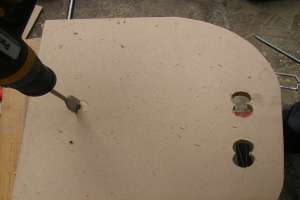 Drill four reasonaly large holes through which we'll lash the pole used to pull the chariot. We used scout staves lashed with sisal for this. Unlike me you'll probably get the holes at the front right first time (the narrower ones). Remember to leave a gap at the back where the axle goes |